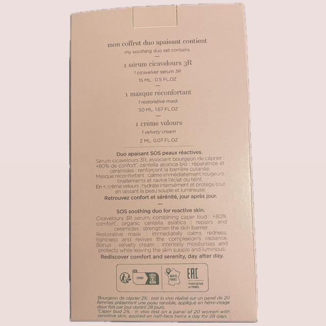 Sérum cicavelours 3R, associant bourgeon de câprier: +80% de confort, centella asiatica bio: réparatrice et céramides: renforcent la barriere cutanée.