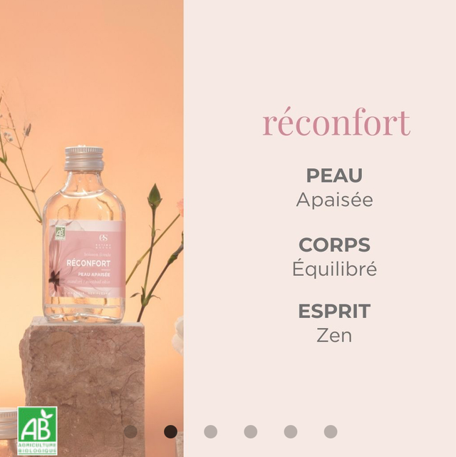 La boisson florale réconfort est une boisson beauté 100 % composée d’hydrolats biologiques, spécialement formulée pour apaiser les peaux sensibles de l’intérieur, réconforter le corps et rééquilibrer les émotions.
