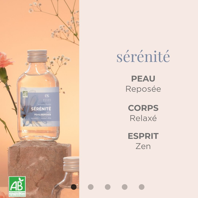 La boisson florale sérénité est une boisson beauté 100 % composée d’hydrolats biologiques, spécialement formulée pour accompagner les fins de journée, favoriser la détente et soutenir la régénération nocturne de la peau.