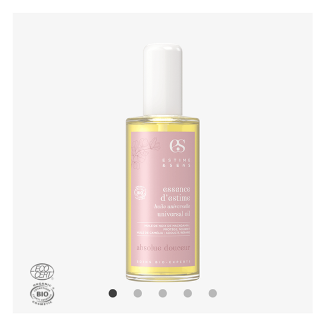 Soin de beauté quotidien, l’essence d’estime absolue douceur prend soin du visage, du corps et des cheveux. Elle hydrate, nourrit, adoucit et protège, même les peaux les plus sèches.